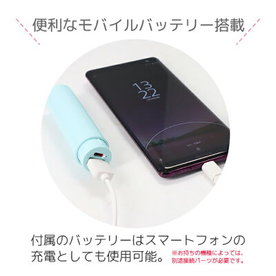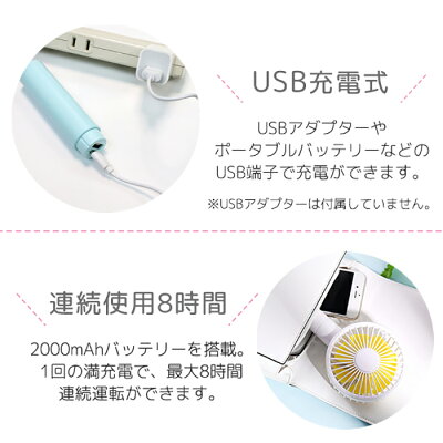 【商品詳細】サイズ(約):(本体)幅9.2×奥行き3.8×高さ20cm (スタンド)幅4×4.7×2cm重量(約):(本体)142g、(スタンド)16g電源方式:USB充電方式風速:(弱)2.71m/s、(中)3.77m/s、(強)4.47m/s連続使用時間:8時間(弱)充電時間:4時間(5V 1A時)出力:5V 1.2A定格容量:2000mAh材質:ABS、PP、シリコン付属品:USBケーブル、シリコンスタンド【送料について】北海道、沖縄、離島は別途送料を頂きます。